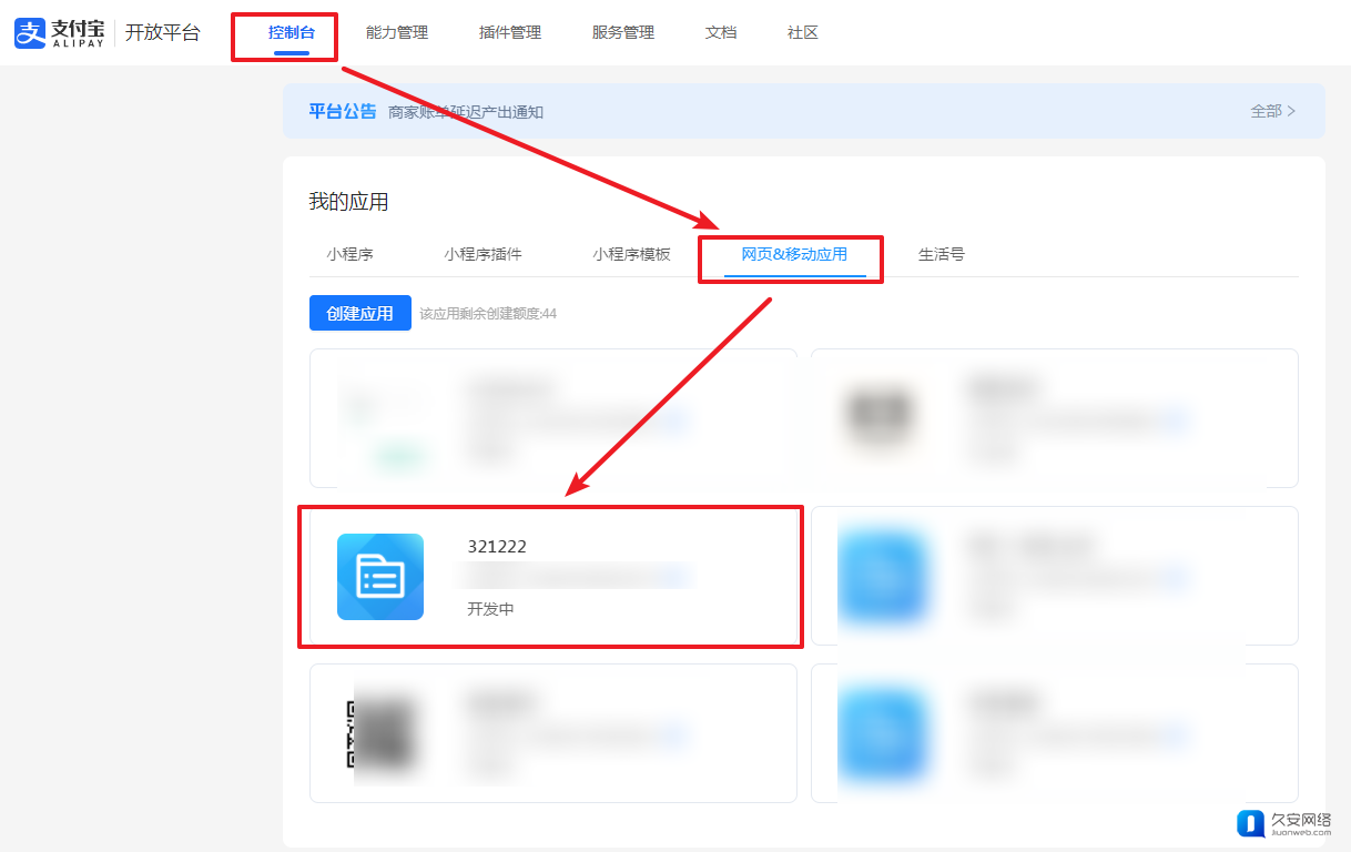2.1 前往支付宝开发平台,进入到控制台—移动&网页应用,进入对应的应用详情页。