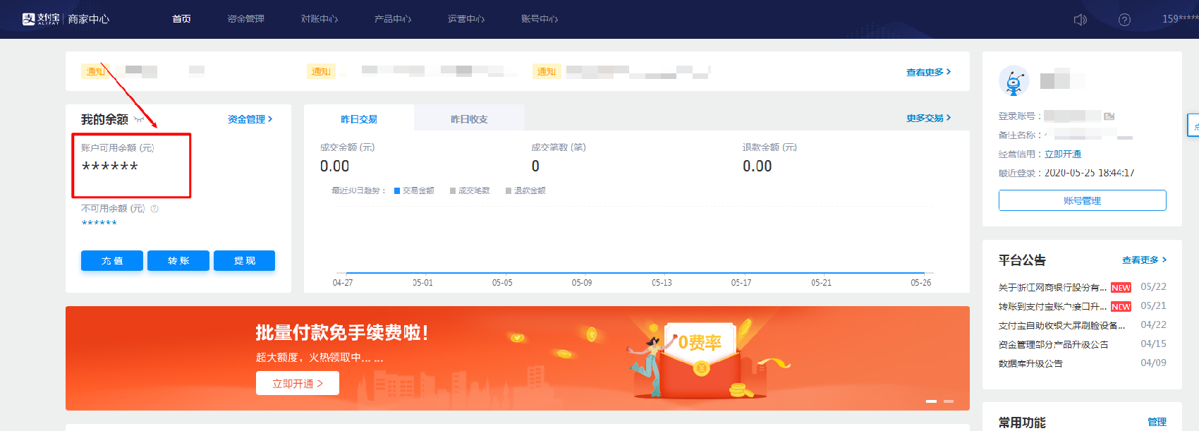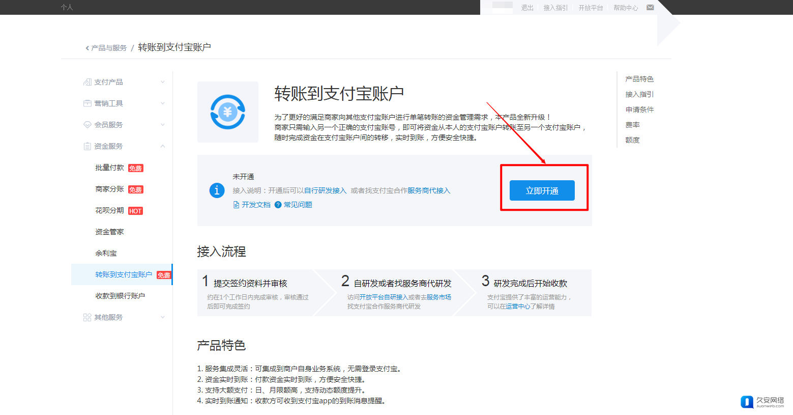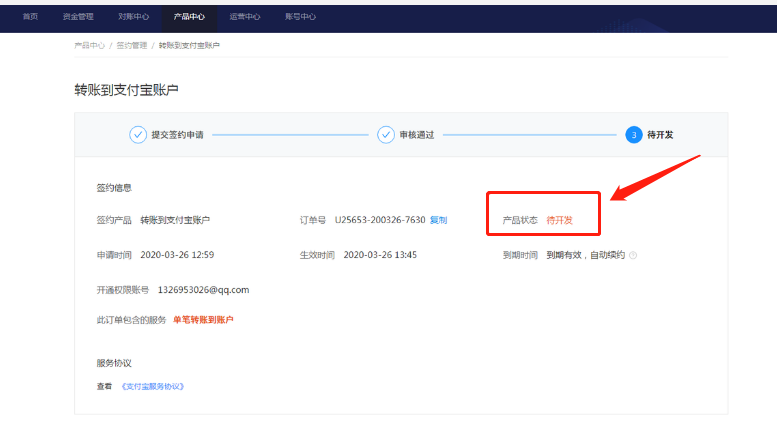 ② 在支付宝商户平台中成功开通“转账到支付宝账户”的产品