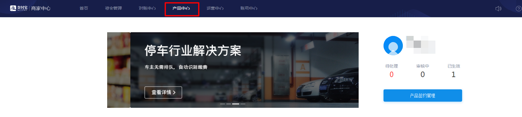 1.1 首先登录支付宝商户平台,在页面点击【产品中心】。如下图: