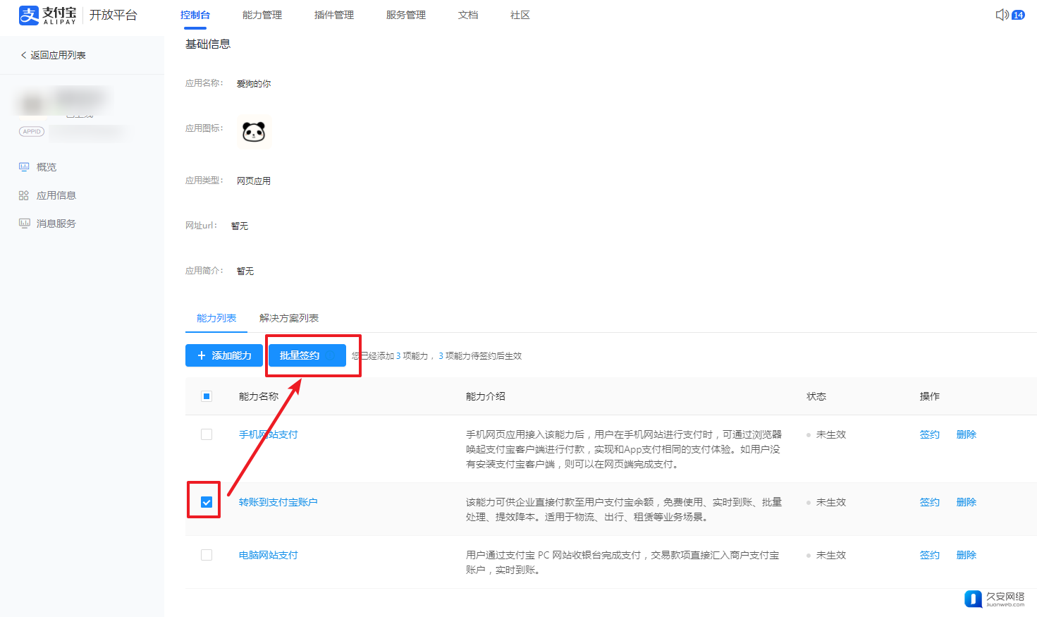 2.4 按照要求填写相关信息进行签约,签约成功后,上线应用,即可完成“转账到支付宝账户”开通。