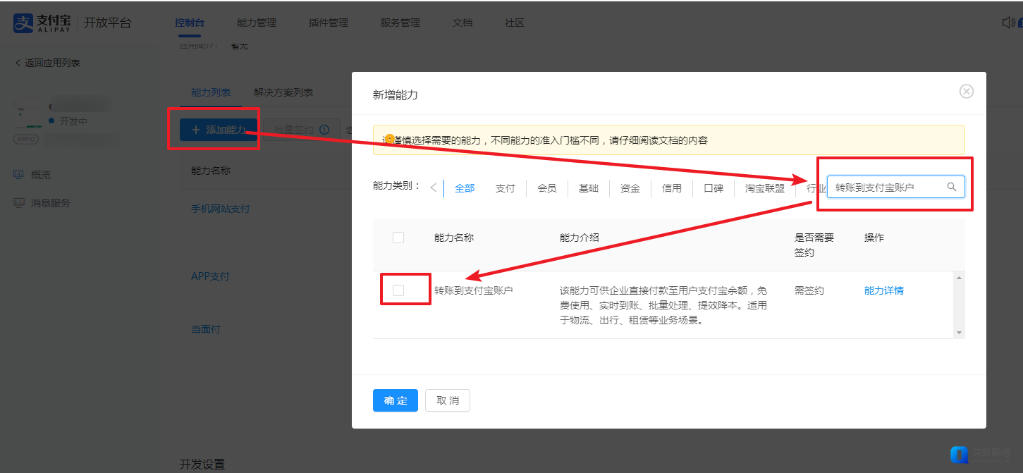 2.2 进入到“我的应用列表”中,点击进入到之前配置过的支付宝支付应用。之后在“能力列表”中,点击“添加能力”,搜索“转账到支付宝账户”。