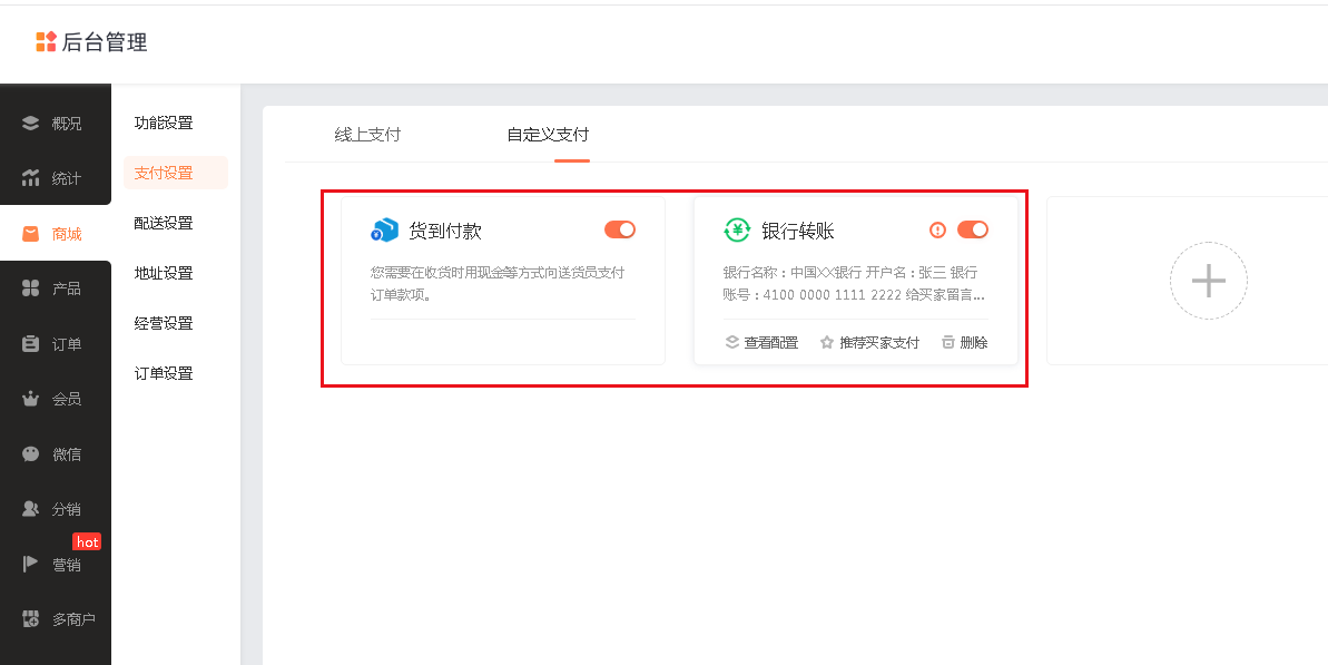 自定义支付方式有两种,一为货到付款,二为银行转账。