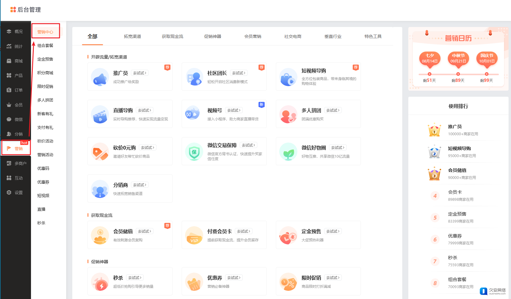 除了以上基础功能,还可以为商城小程序增加一些营销功能,与客户进行更好的互动。商城提供多种营销功能,覆盖裂变获客、促活转化、留存复购等多个环节,助力商家引爆更多销量。