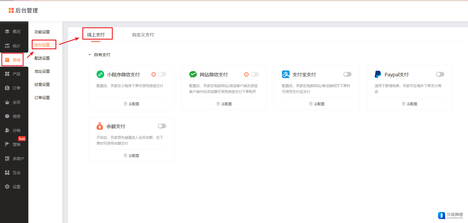 如商家需要自定义支付,可进入【商城-支付设置-自定义支付】中开启。