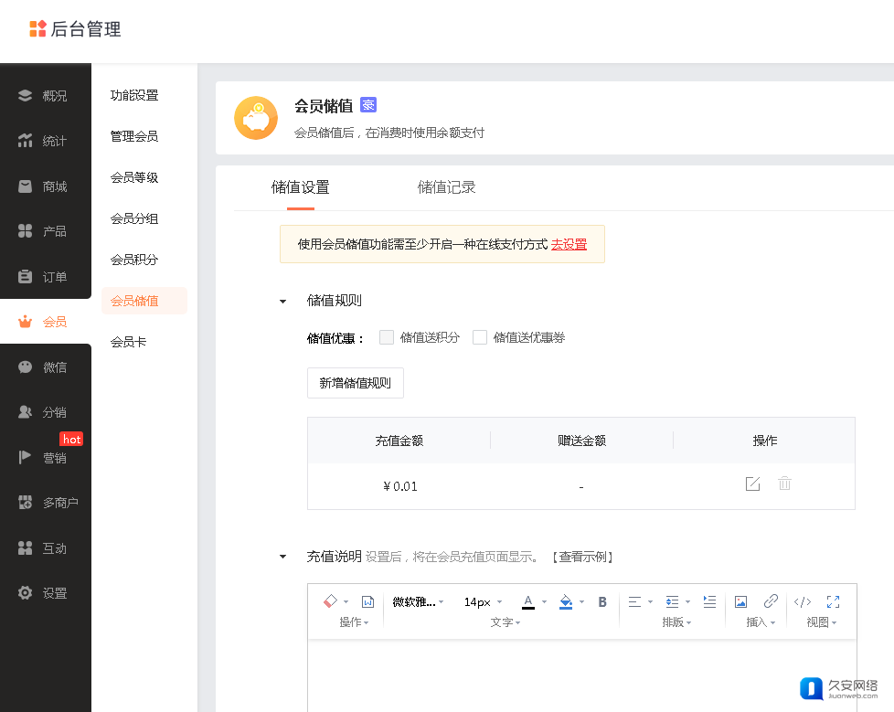 余额支付即让客户使用会员储值的余额进行商品支付,因此商家可进入到商城后台管理系统【会员-会员储值】中进行设置。