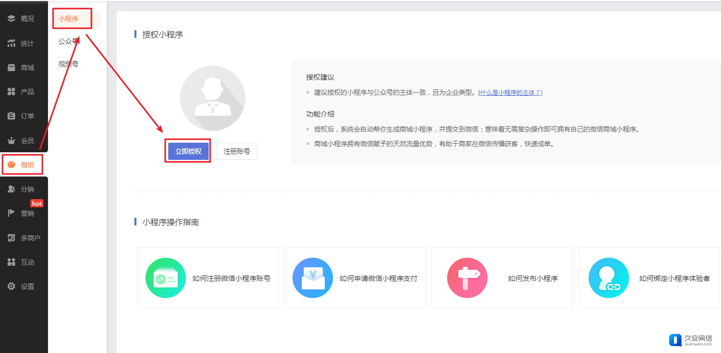 如果您已拥有微信小程序帐号,可直接进入【商城-微信-小程序】中点击“立即授权”,将微信小程序帐号授权给商城。