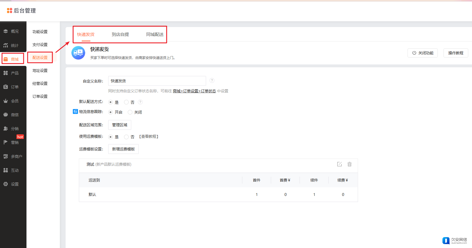 ⑥ 配送方式设置:支持商家添加配送项名称以及配送费用,添加后,买家下单即可选择设置的配送快递。