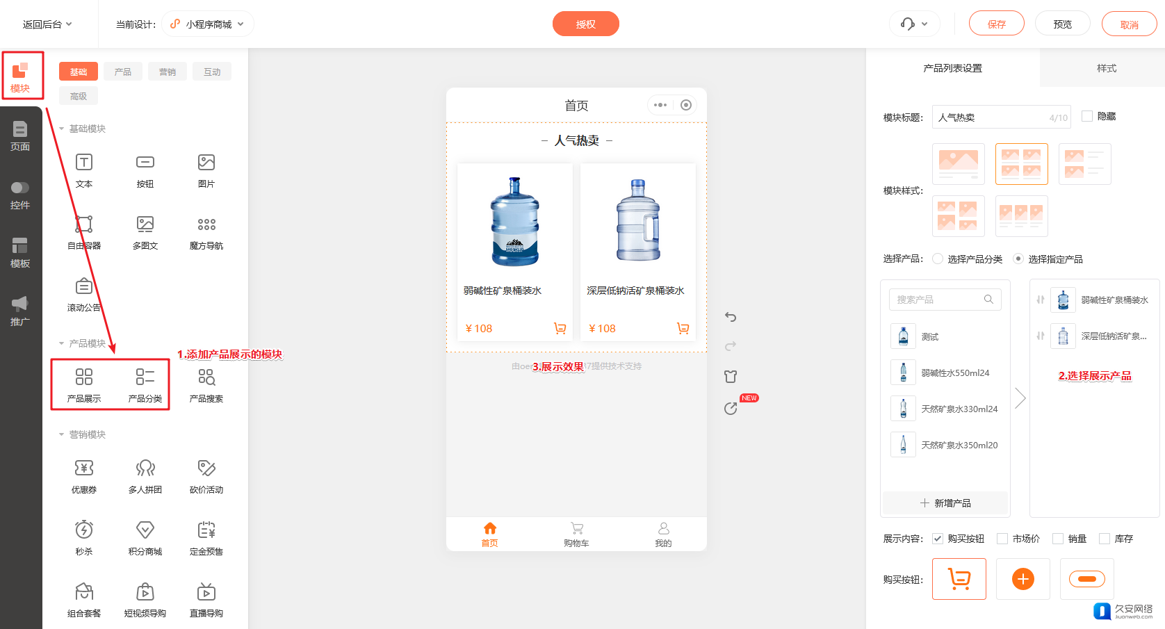 添加完商品后,需要在商城中展示产品,客户才能够看到产品,可通过“产品展示”模块来展示产品。