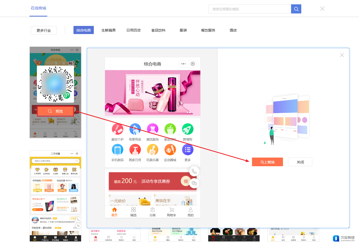 鼠标移动至模板中,可点击预览模板,如喜欢当前模板可点击【马上替换】应用该模板。