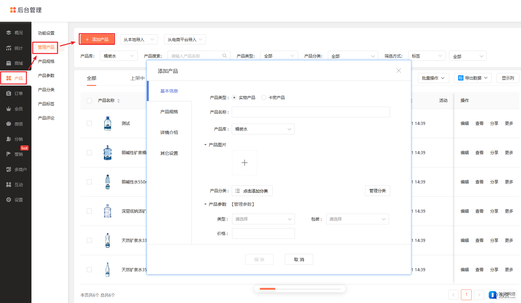 操作路径:商城管理后台-产品-管理产品-添加产品。(商城支持单个或批量添加产品)