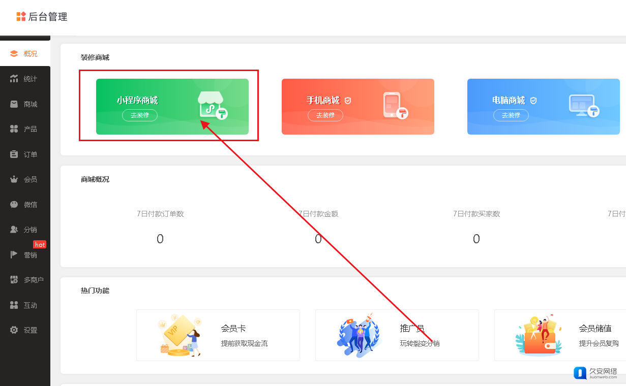 商家进入到商城后台管理系统【概况-小程序商城】后,即可开始装修商城。