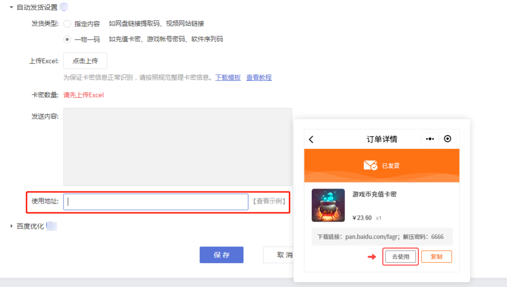 支持设置地址,产品发货后,买家在订单中点击“去使用”,即可跳转至设置好的地址。