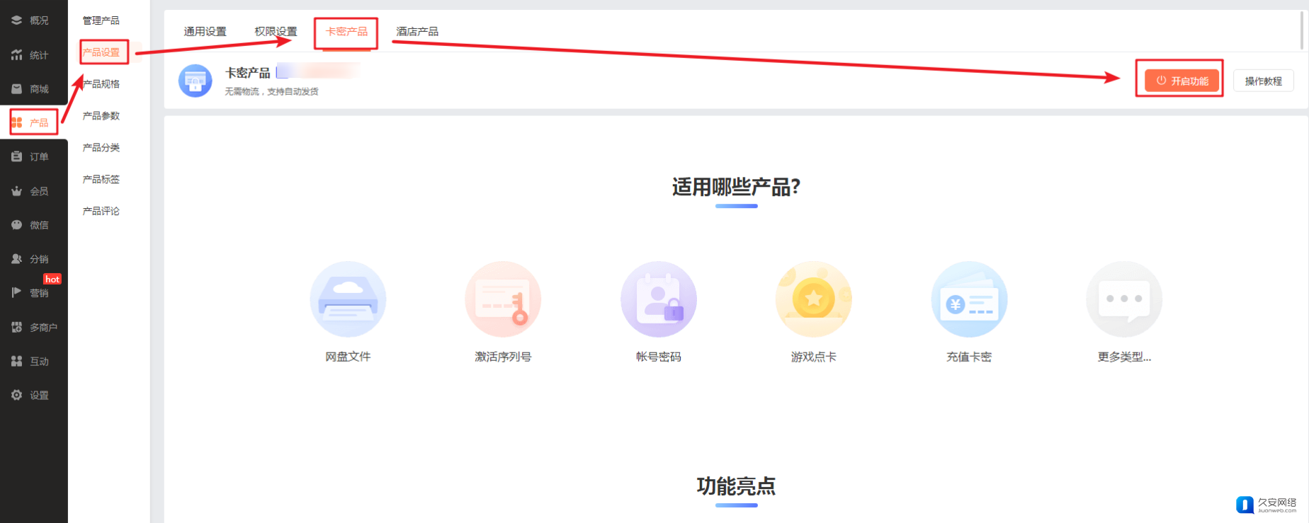 1. 开启卡密产品功能