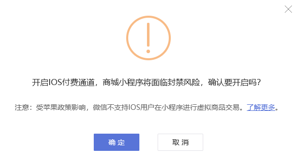 ③开启通道:买家使用苹果手机访问小程序,可正常购买卡密产品。但这样有封禁风险,建议谨慎开启。若一定要开启,建议商城小程序审核通过后再选择开启。