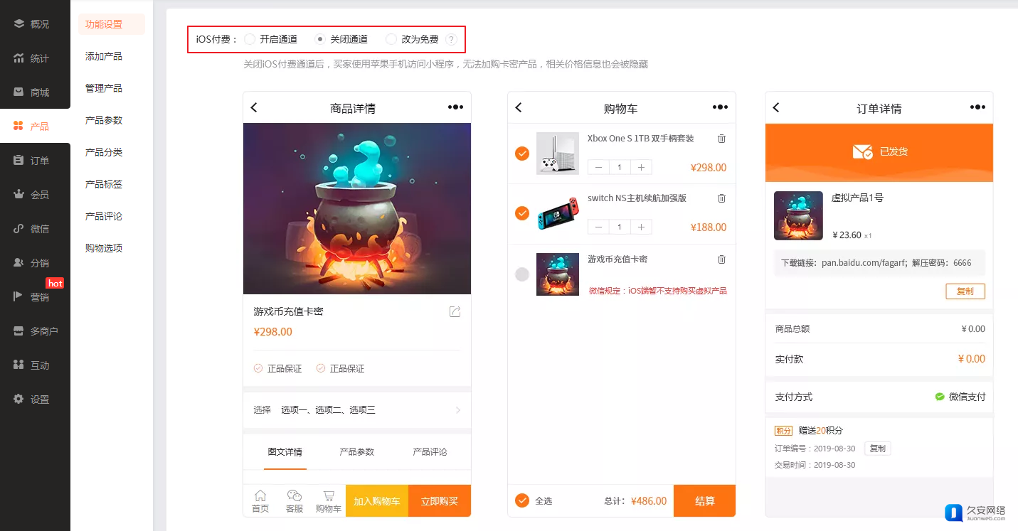 ①关闭通道:关闭iOS付费通道后,买家使用苹果手机访问小程序,无法加购卡密产品,相关价格信息也会被隐藏。