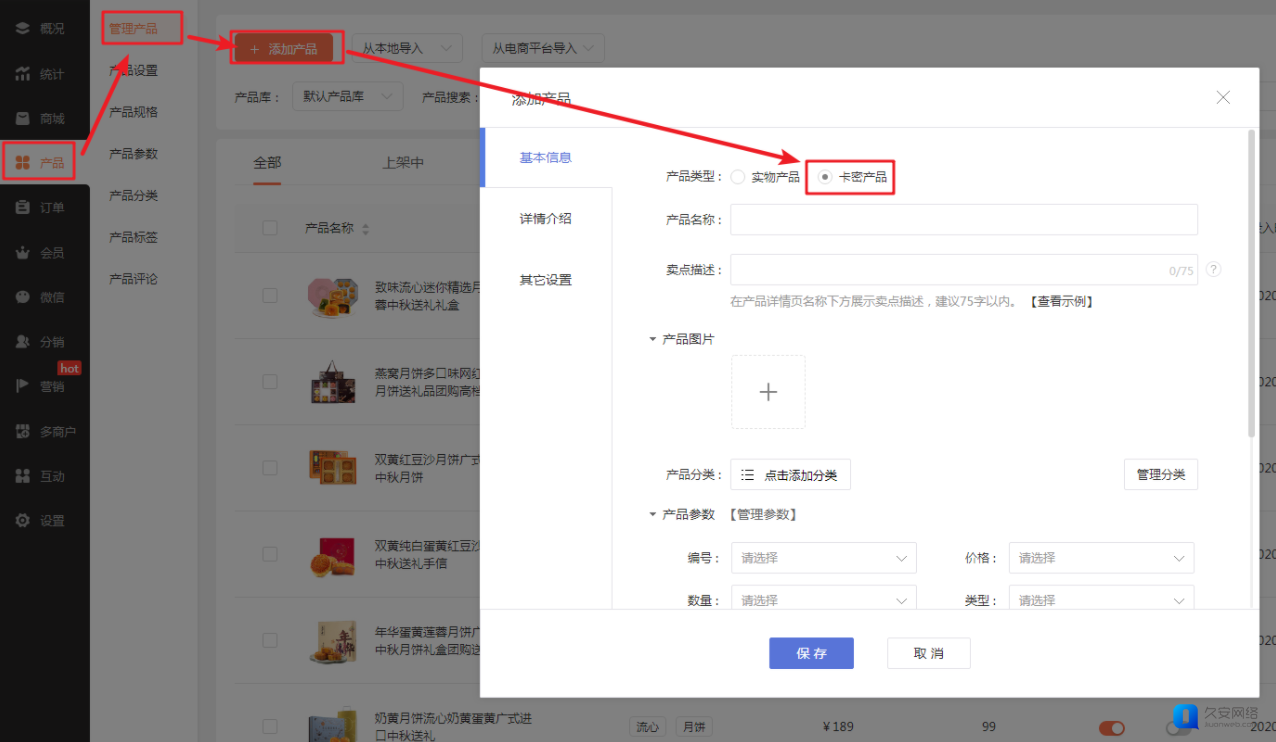 2.1 开启功能后,在添加产品时可选择产品类型为“卡密产品”。