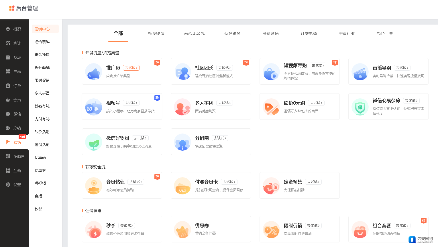 卡密产品支持参与短视频导购、组合套餐、定金预售、积分商城、限时促销、拼团、砍价、秒杀等多种营销活动,也支持参与推广员等分销模式,助力商家轻松成交