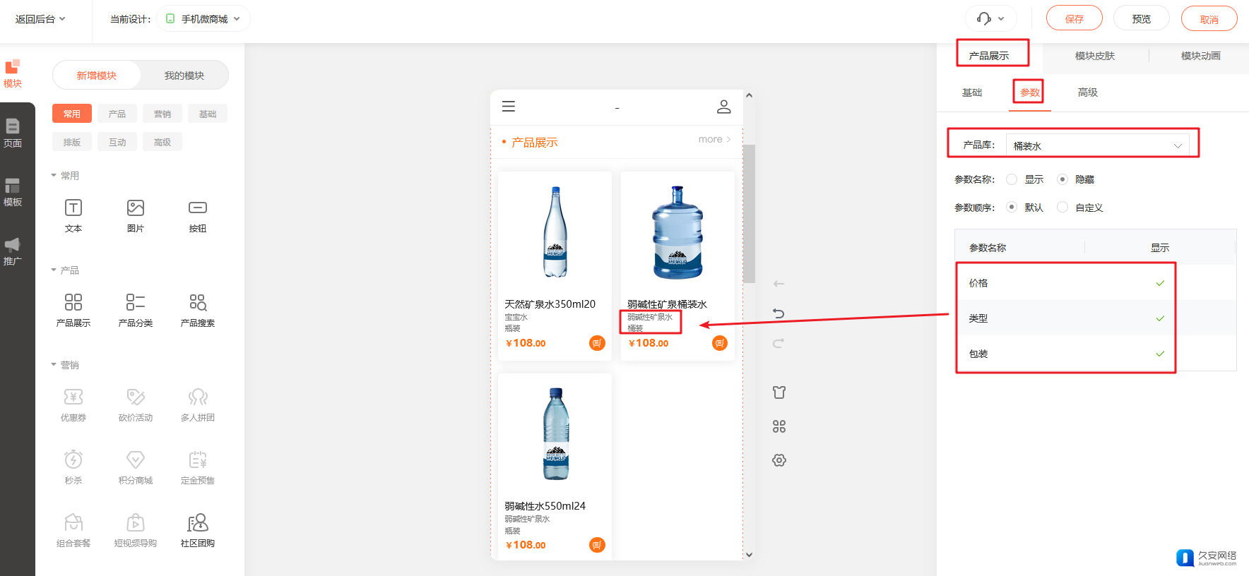 3. 在产品展示模块,使用“产品参数-产品库”作为筛选条件展示产品