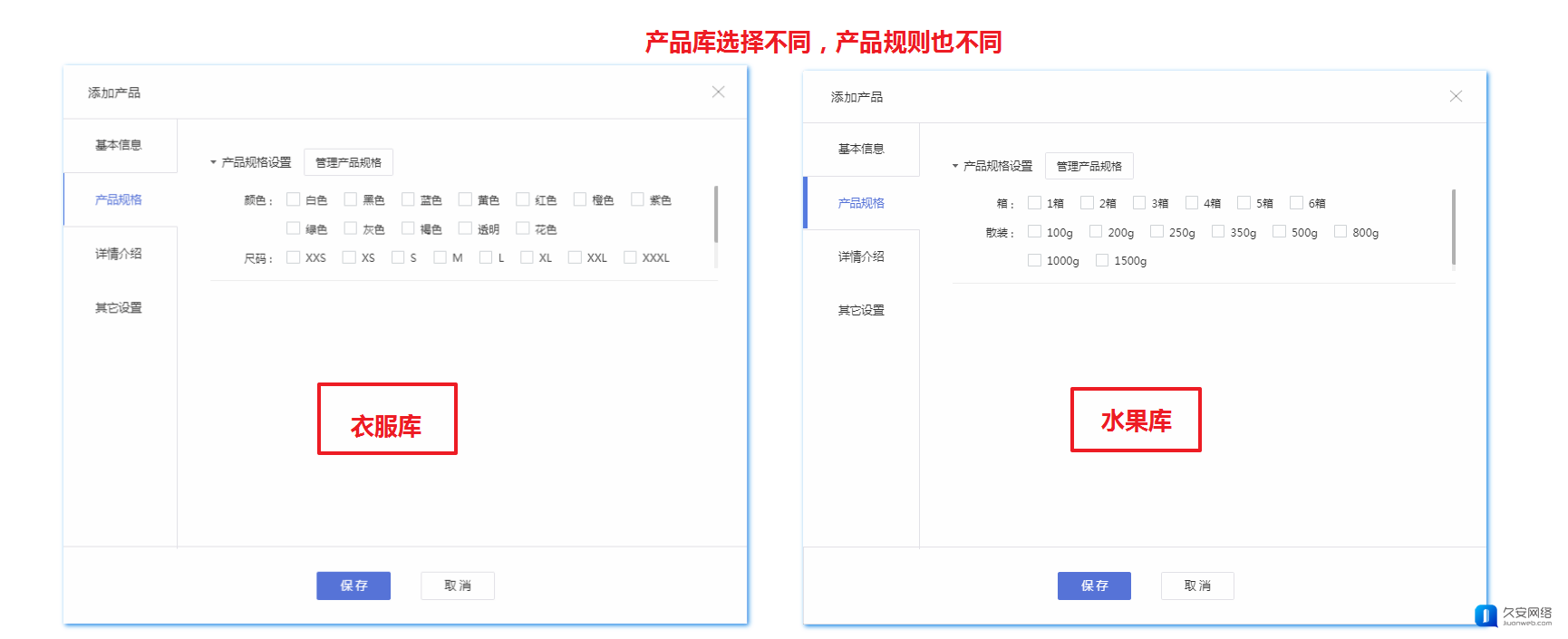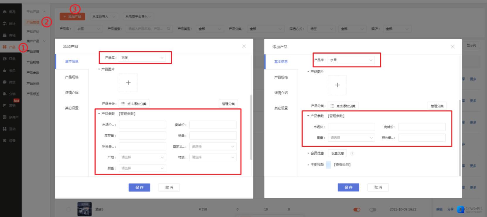 商家在商城后台开启不同的产品库后,可在不同的产品库下设置不同的产品参数、购物选项,让商家的产品设置更加灵活,实现的产品功能更加强大。