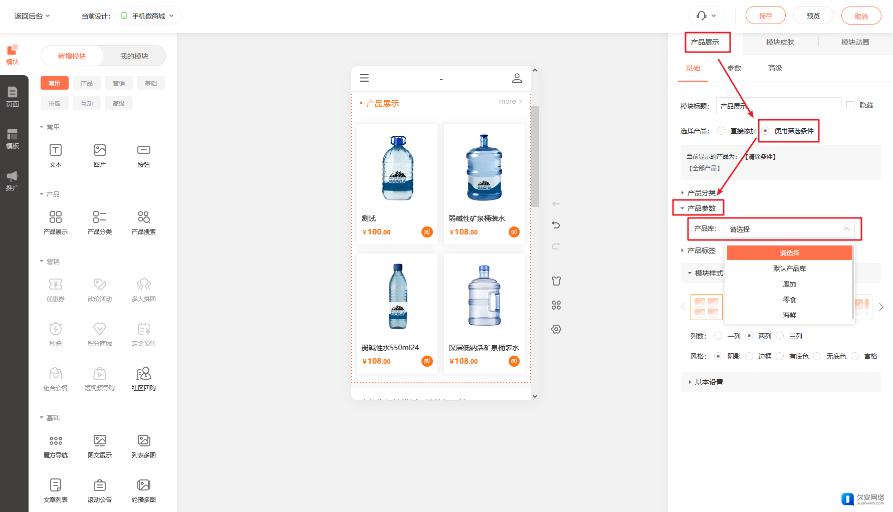 在手机商城或电脑商城中添加产品展示模块时,可使用“筛选条件-产品参数-产品库”展示产品。