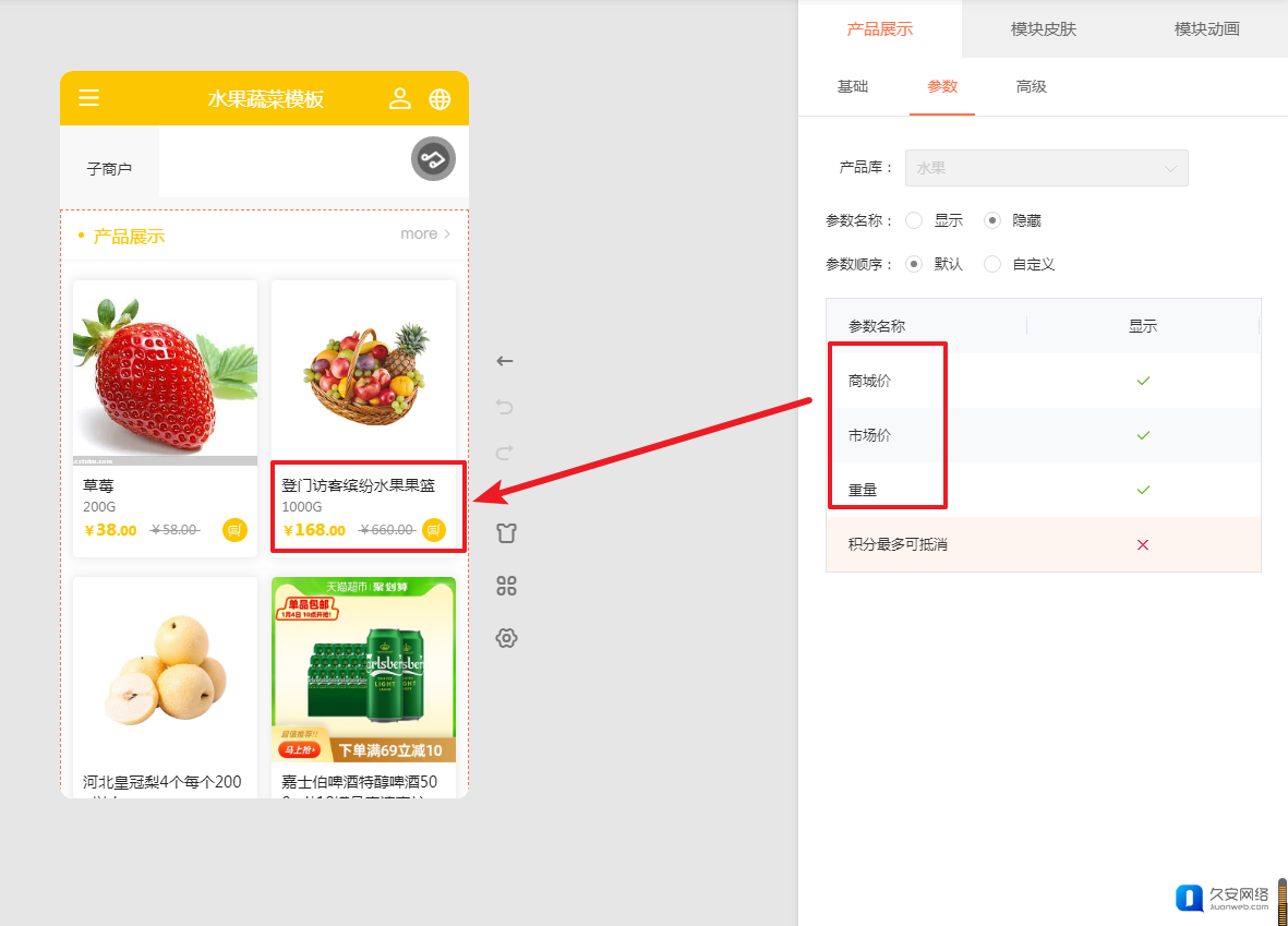 在手机商城或电脑商城中添加产品展示模块时,可同时展示归属于不同产品库的产品,并让它们显示不同的产品参数。