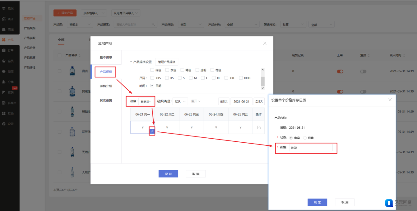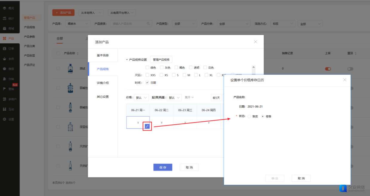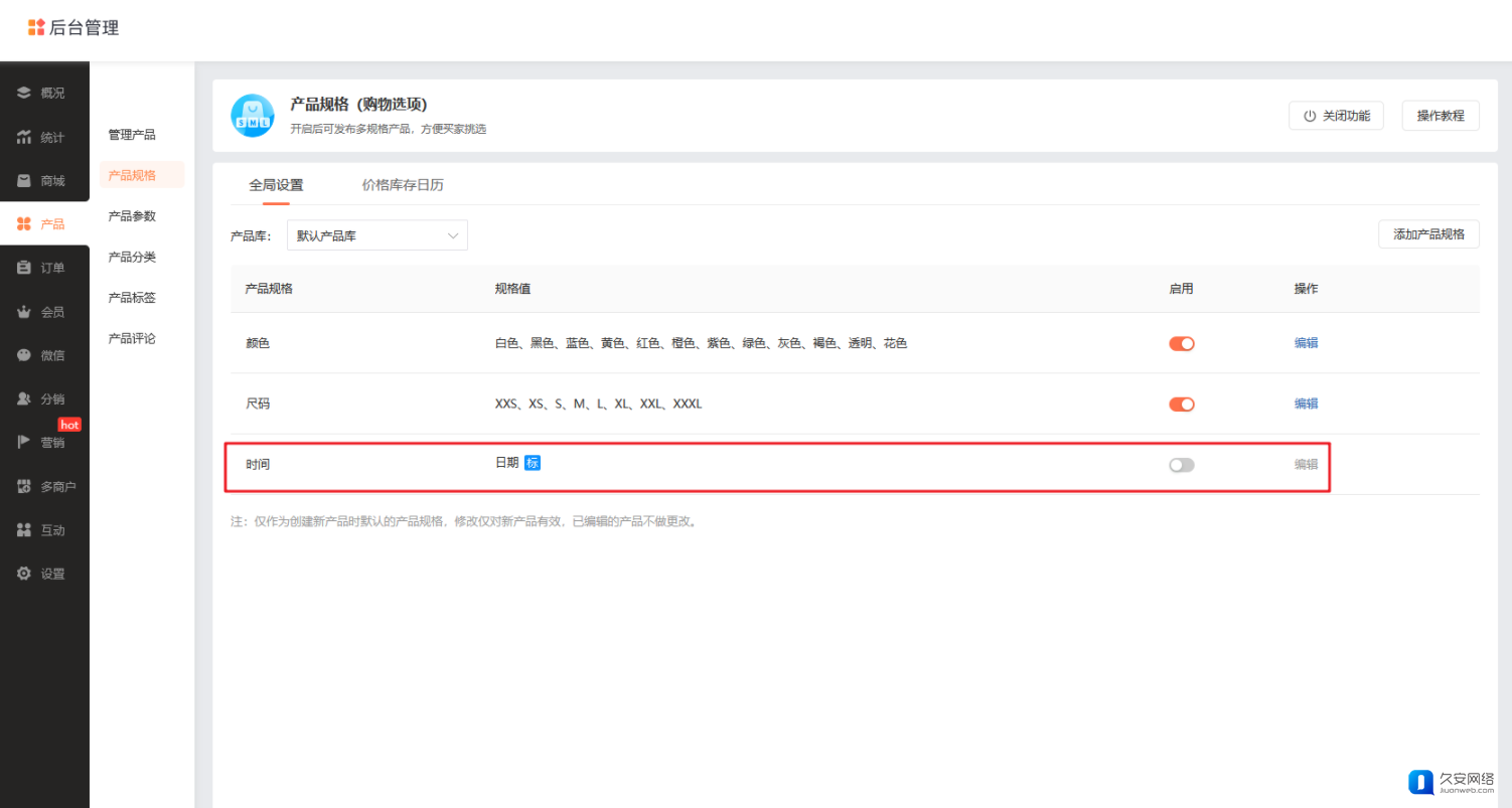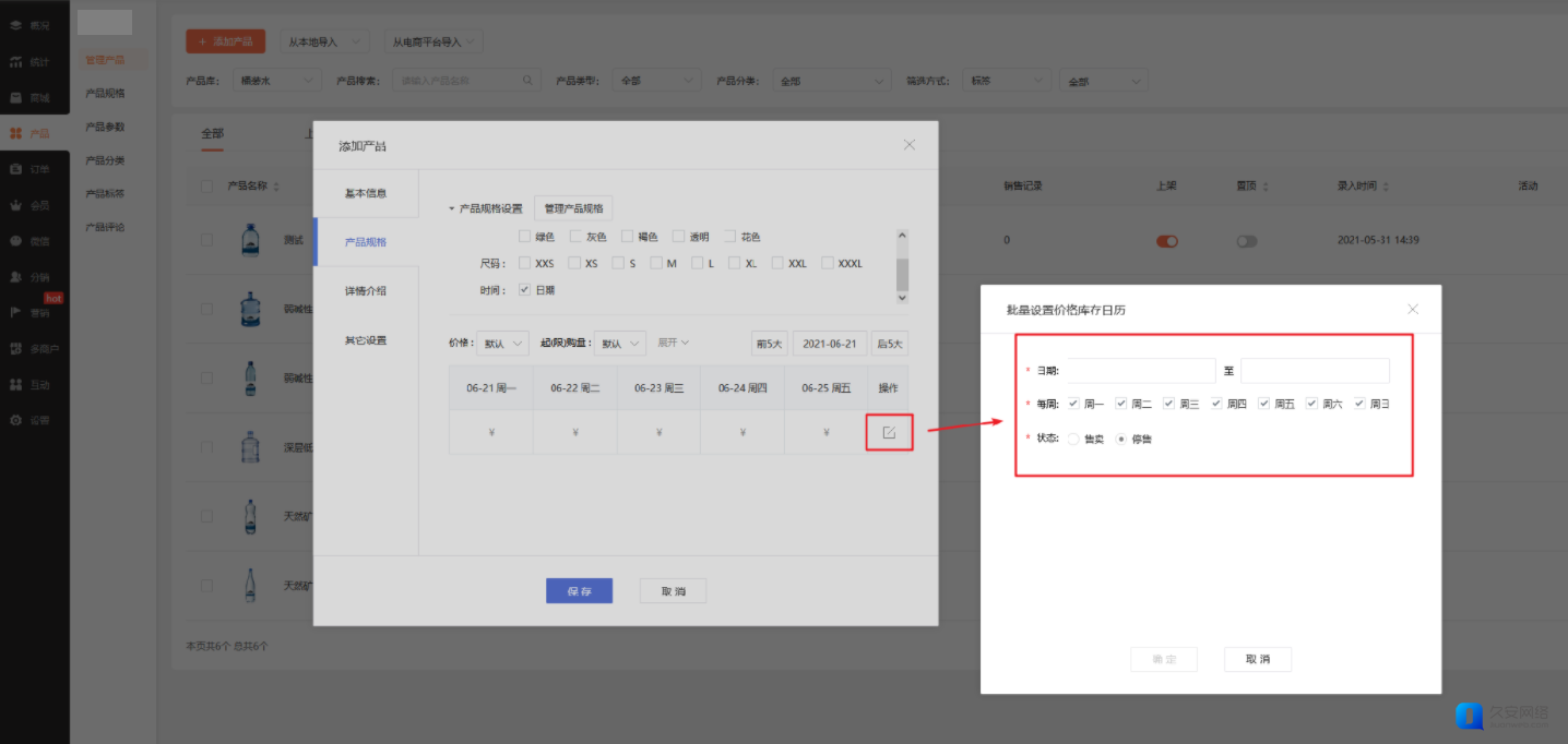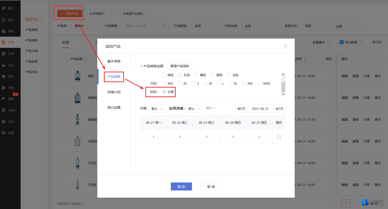 1. 启用后,在添加产品时勾选【时间】产品规格,即可为产品设置不同时间的价格库存。