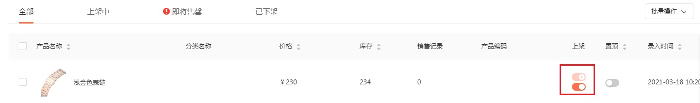 1.3 在返回商品列表中,可以看到【上架】区域有个秒表的图标,即定时上架产品成功!