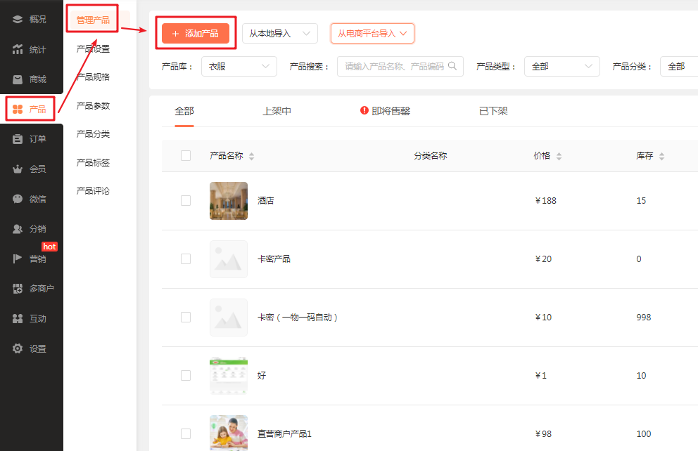 1.1 在商城后台系统左侧导航栏中,选择【产品】栏目,进入【管理产品】,在点击【添加产品】按钮。