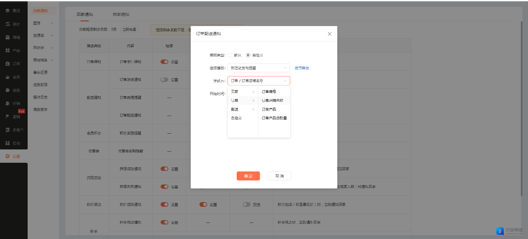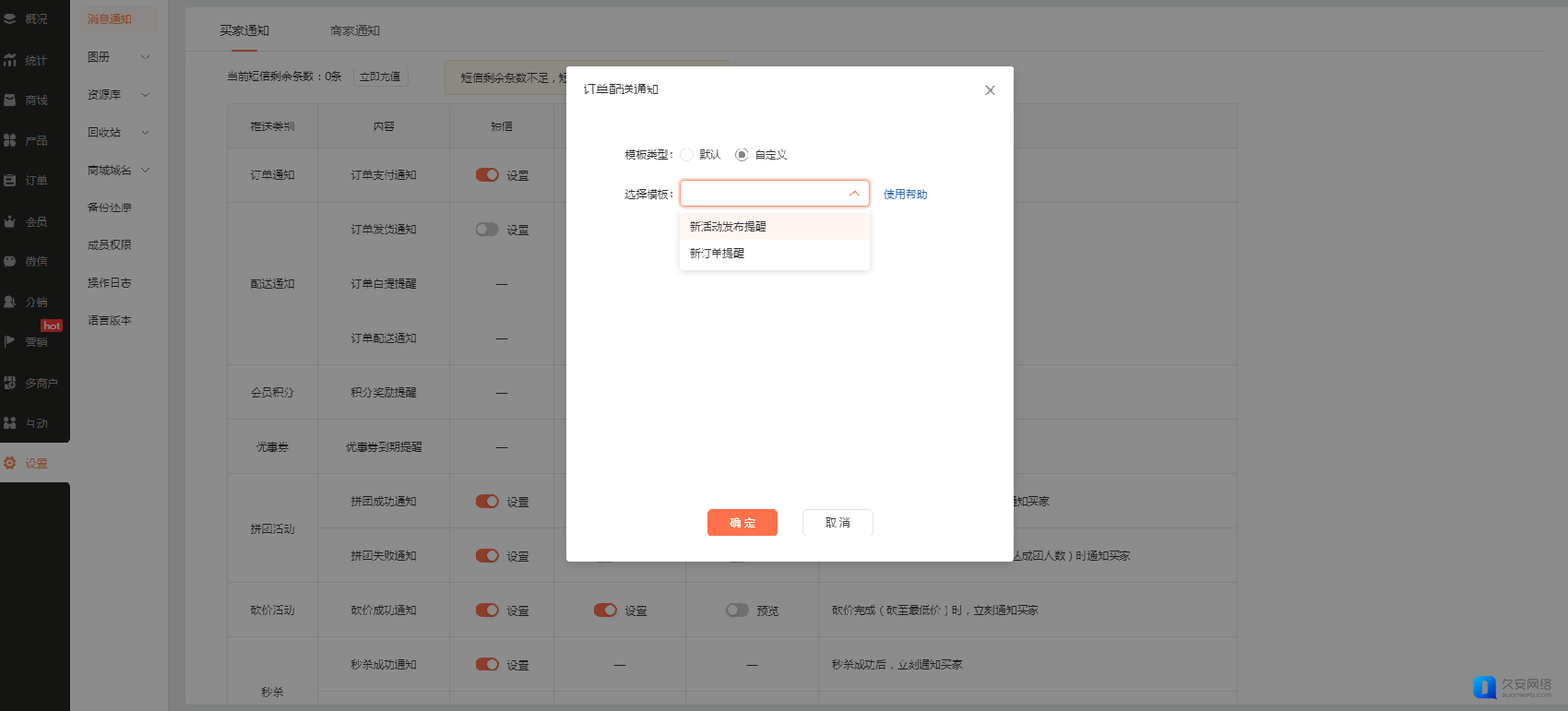 3. 在商城管理中选择刚刚在微信小程序中自行添加的消息模板