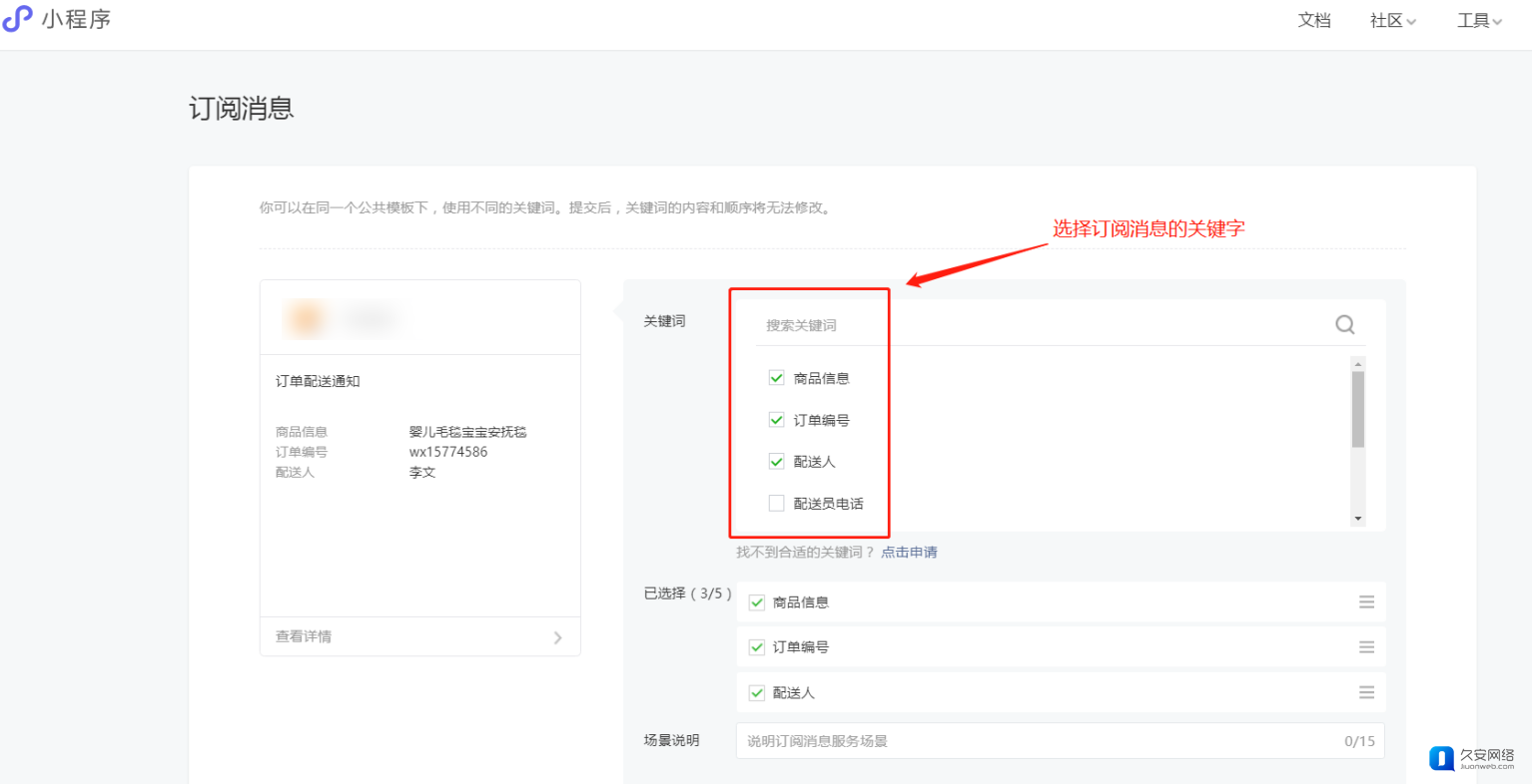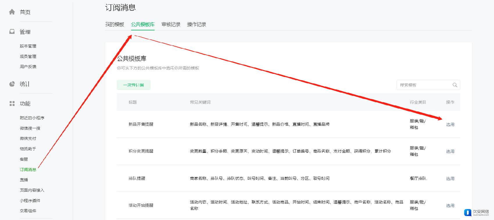 (注:消息模板有小程序行业类目要求,添加小程序服务类目后可在模板库中选用更多模板。)