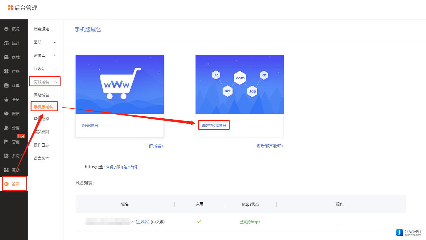 1. 先登录进入商城后台系统,点击【系统设置】→【商城域名】→【手机版域名】→【绑定外部域名】。