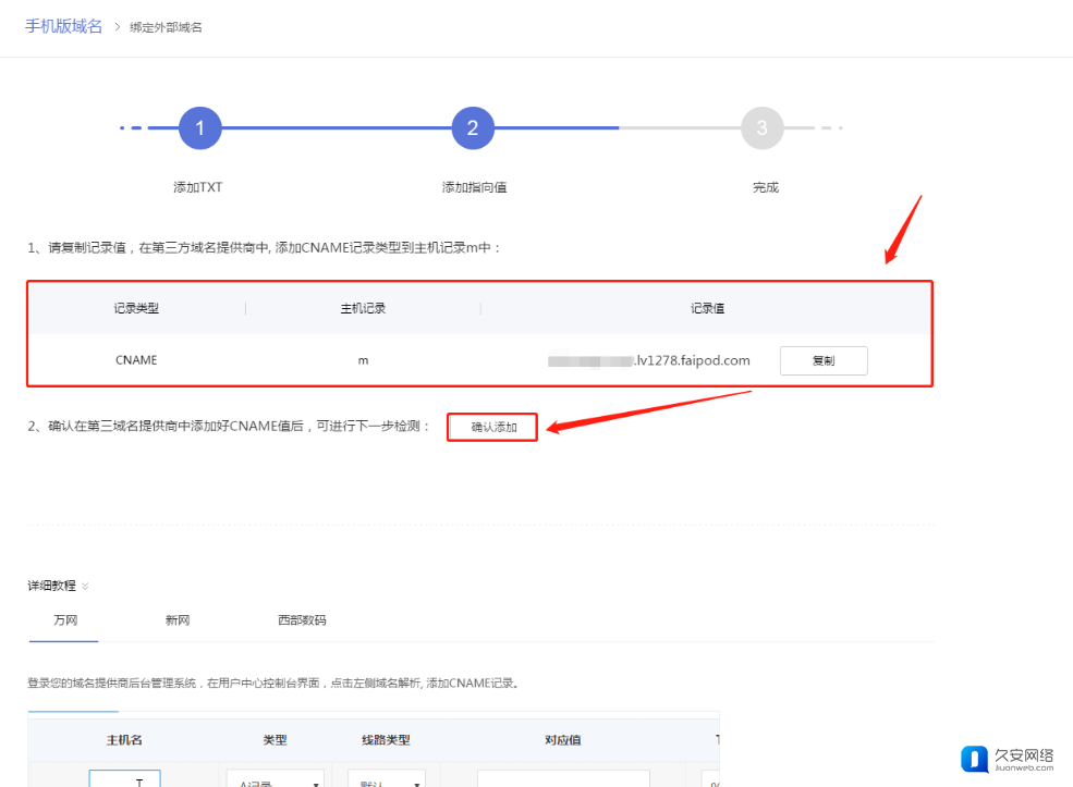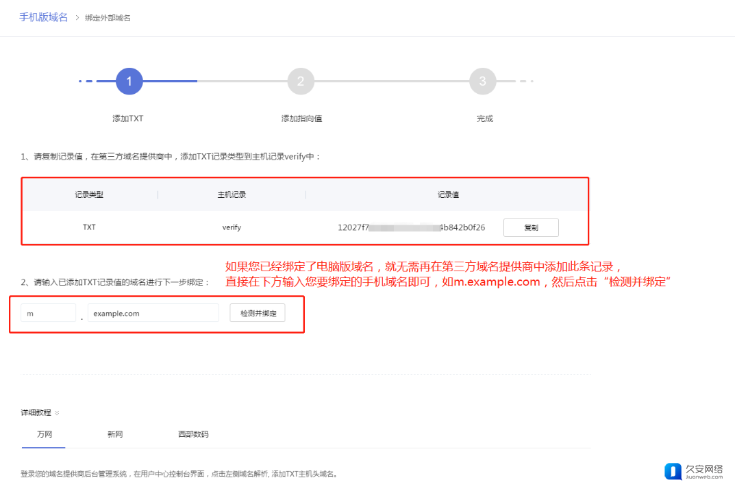 (注意:如果您此前已经绑定了电脑版域名在同一个网站中,如www.example.com,那么您的第三方域名提供商中,就已经存在这条TXT记录,无需重复添加!直接输入您的手机版域名,如m.example.com,点击“检测并绑定”即可!)