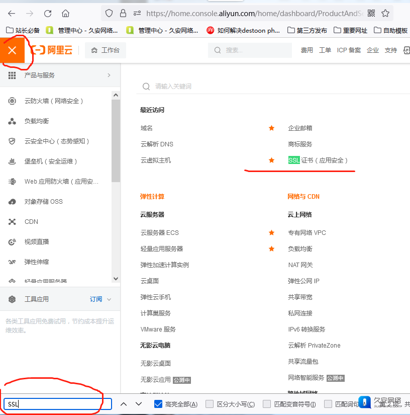 2,进入后台点击左上角按钮,找到右边的SSL证书,也可按CTRL+F 查找 SSL。
