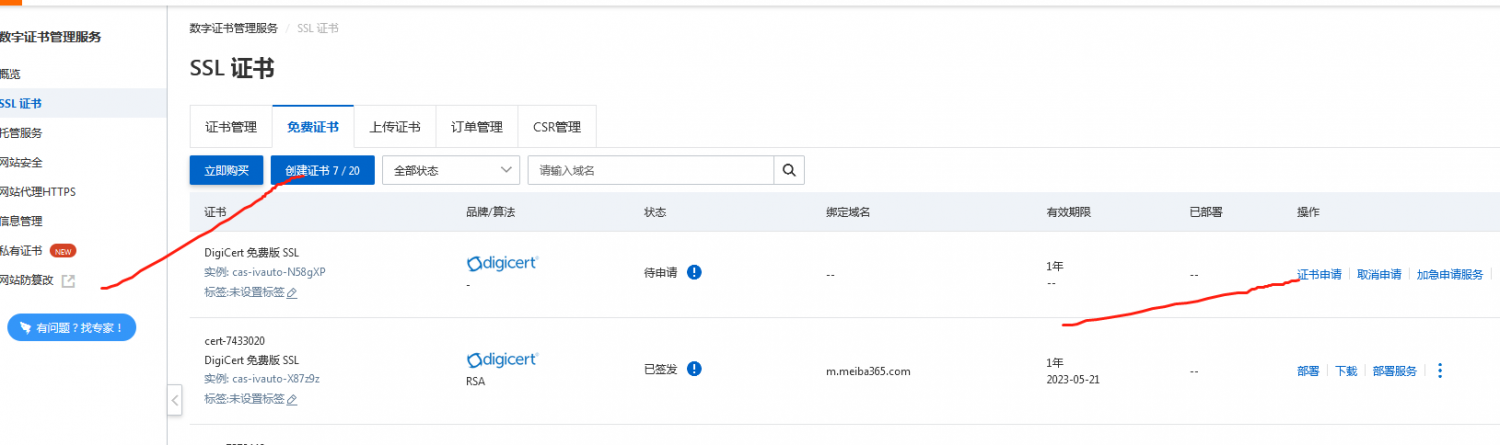 (注意:“证书部署中”时,需保证域名可以正常访问,否则无法成功部署证书;如域名无法正常访问,请检查域名解析是否暂停)