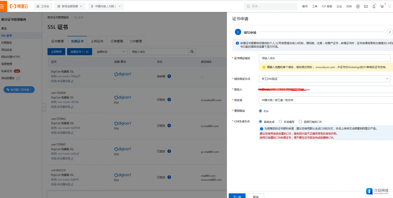 5,点击免创建证书,自动创建一个状态为待申请的免费版SSL,点击右侧的证书申请。弹窗后,新建联系人,随便填写一个联系方式或地址即可