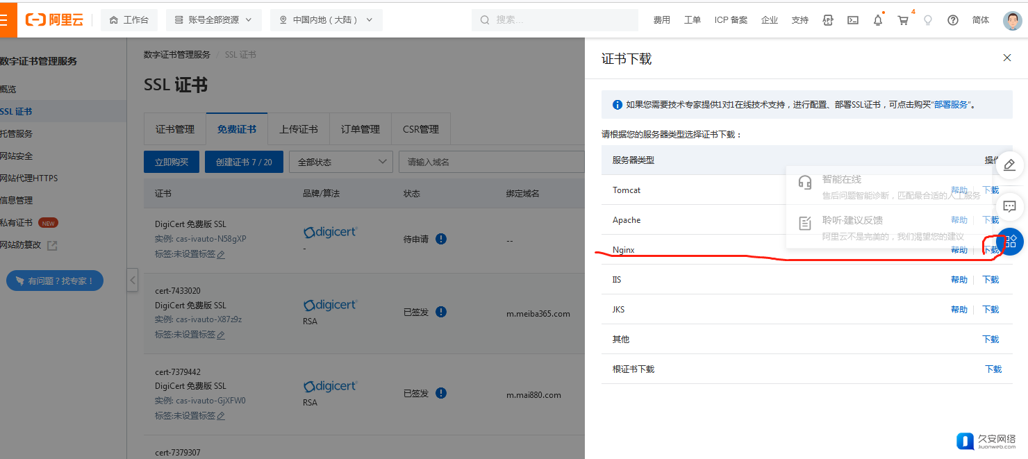 5,申请大致需要几分钟或更长时间,申请成功后,右侧就会出现 下载链接,点击下载,弹窗,点击 Nginx 右侧下载即可保存到本地。
