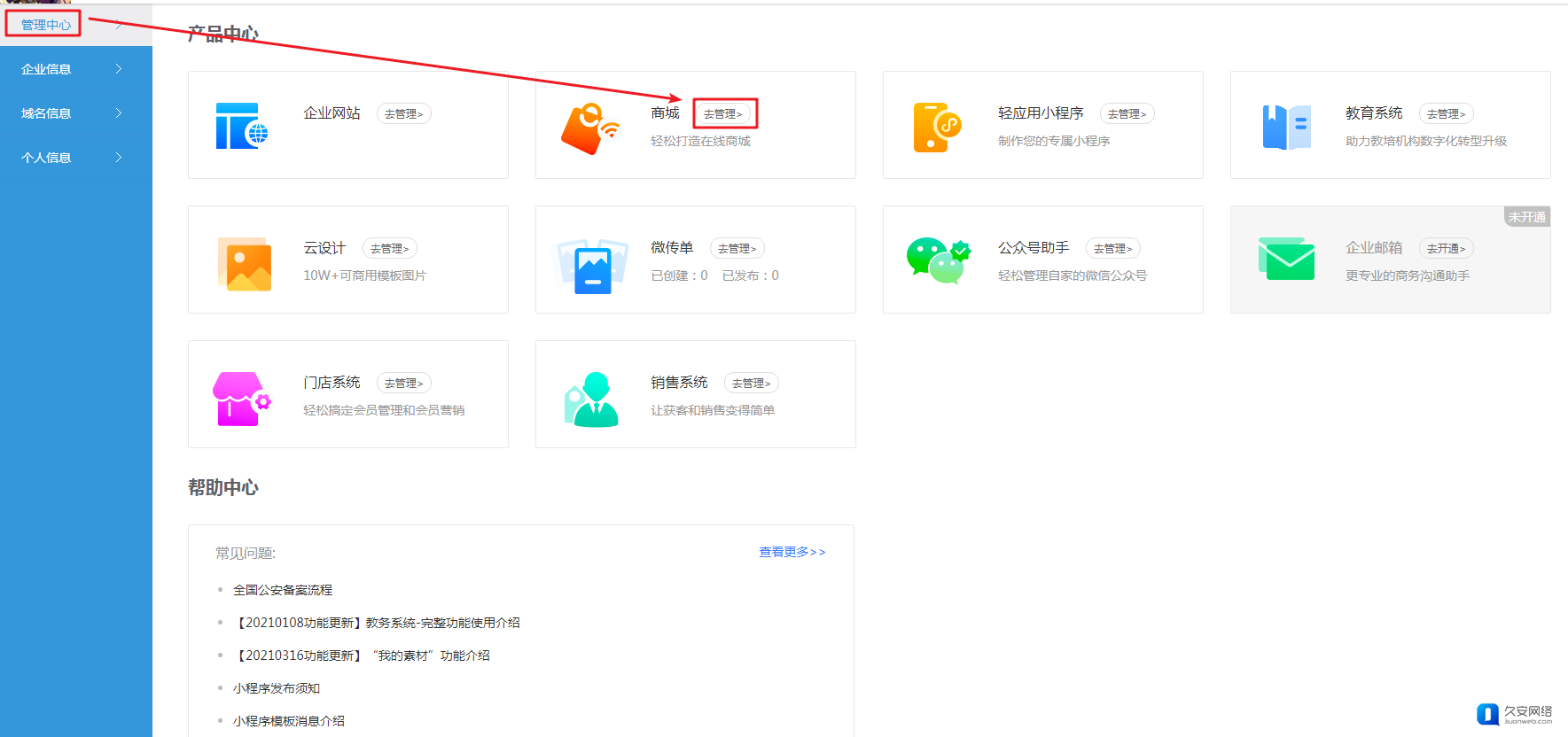 2.1 回到您的企业中心,点击【管理中心-商城--进入管理】。