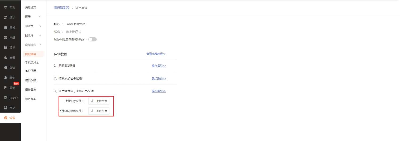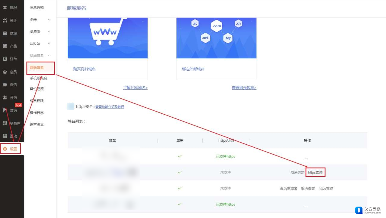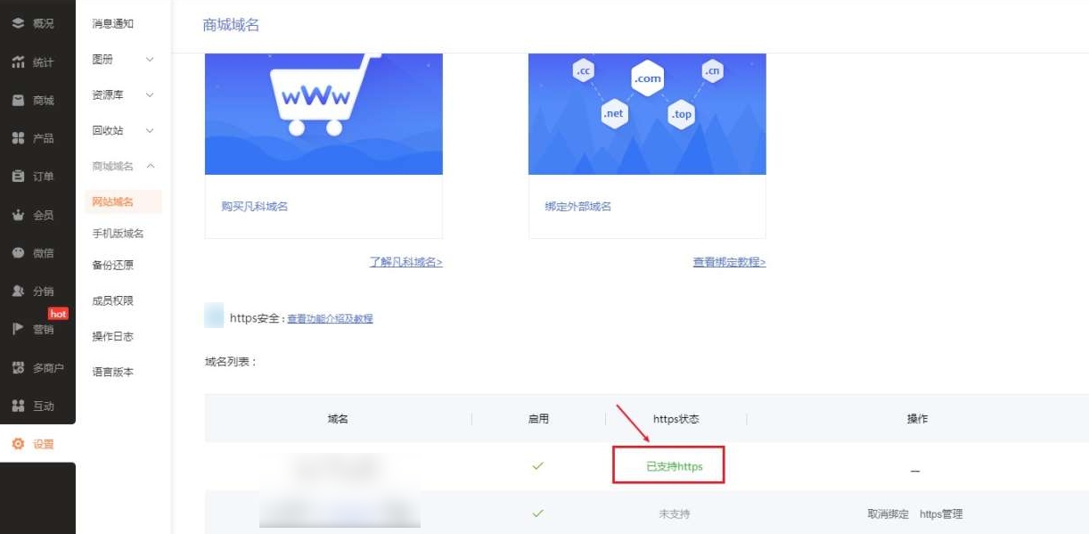 2.2 电脑版域名在【设置-网站域名-域名列表】里找到购买了SSL证书的域名,点击域名右侧的【https管理】。