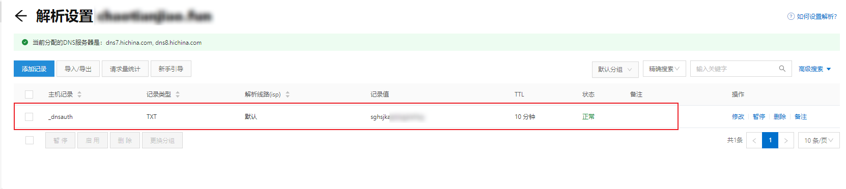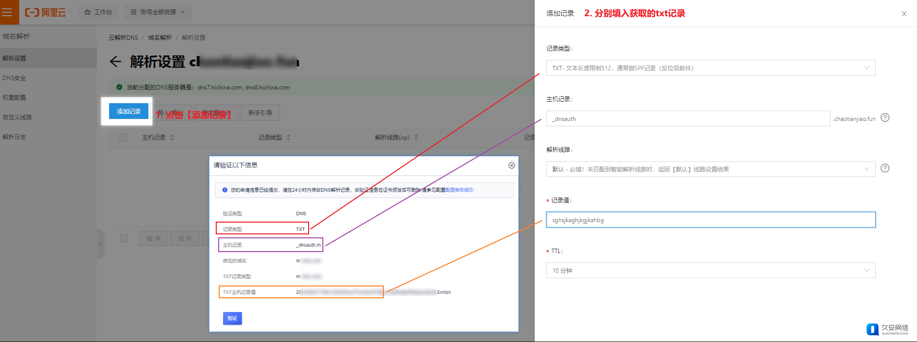 点击【添加记录】,分别填入获取的txt记录。(未提及内容选择默认即可)