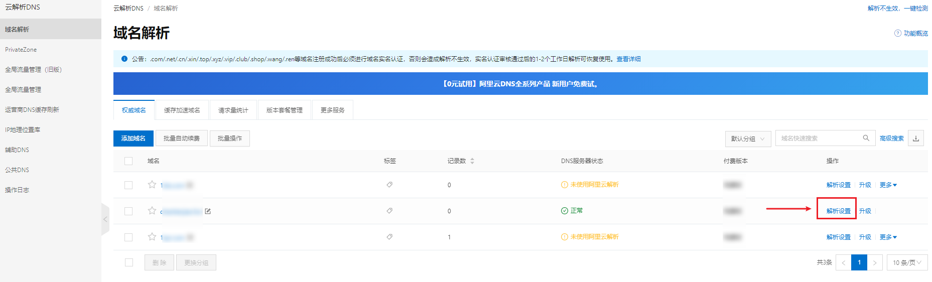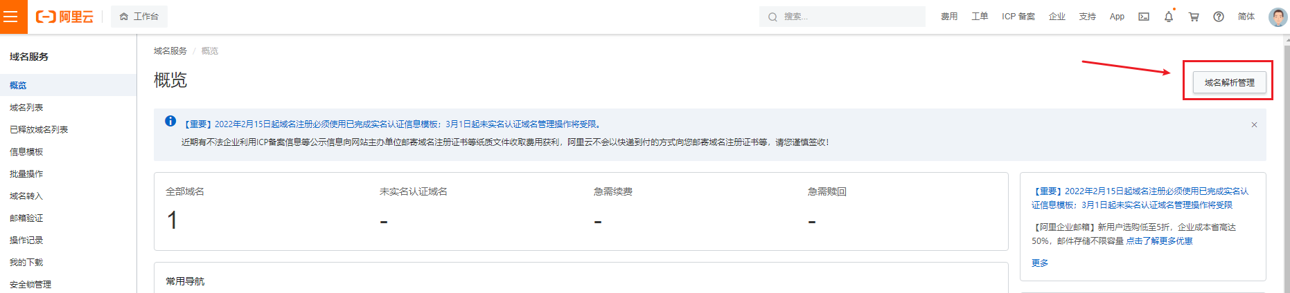 右上方点击【域名解析管理】。