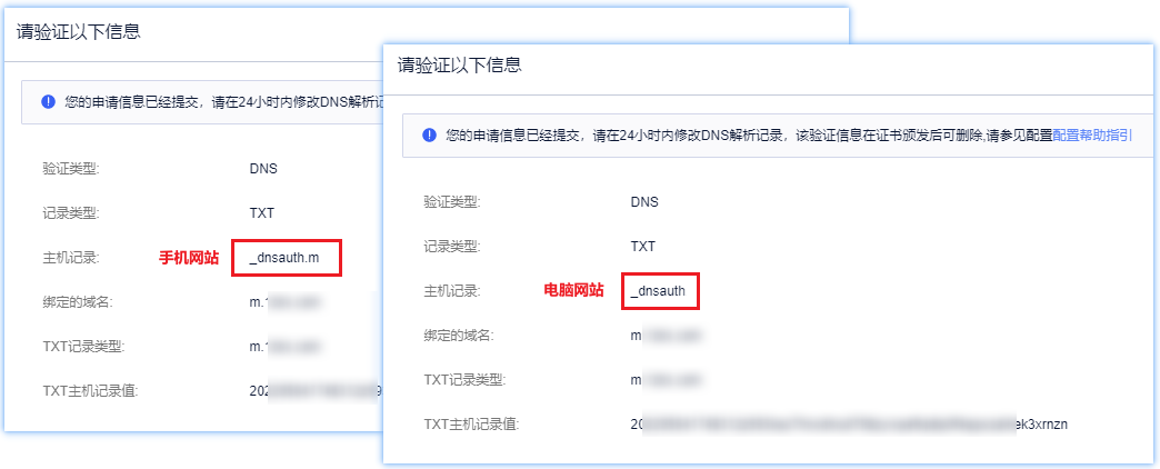 手机网站(m.xxx.com)主机记录填写:_dnsauth.m