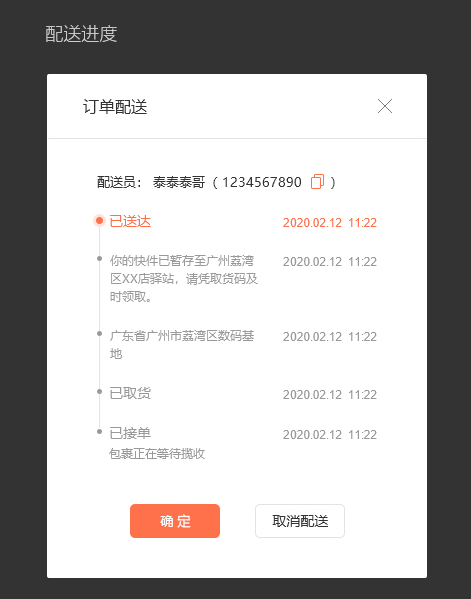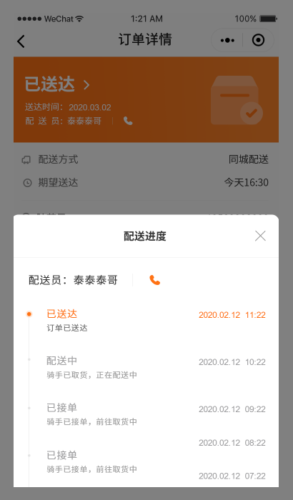 买家在下单后,订单详情页将显示配送员、配送员电话号码、接单时间以及配送进度(已接单/已取货/配送中),知悉订单配送状态,且能够联系骑手,获得前沿配送进度。