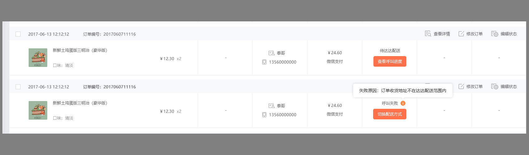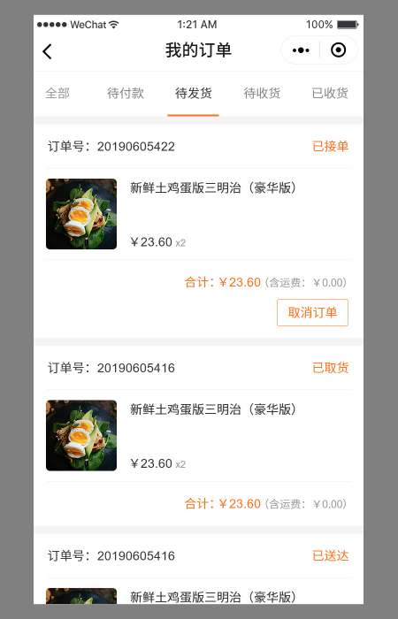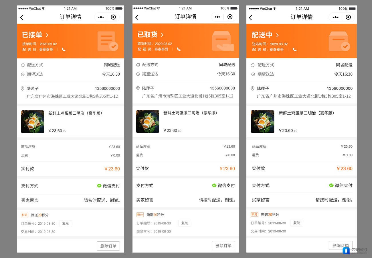 在订单被第三方配送时,订单列表支持显示第三方返回的订单状态:已接单/已取货/已送达。买家可清楚了解订单由哪种配送方式配送。