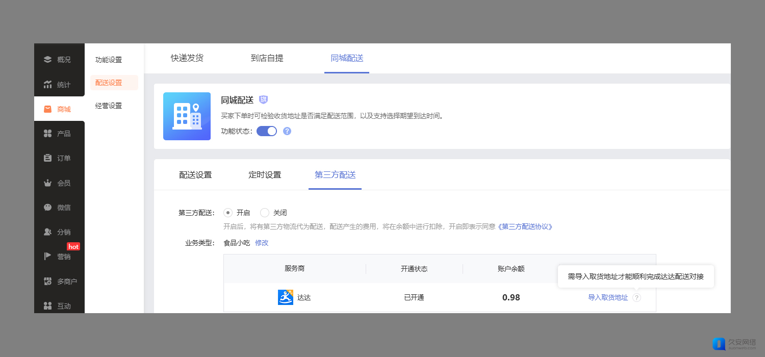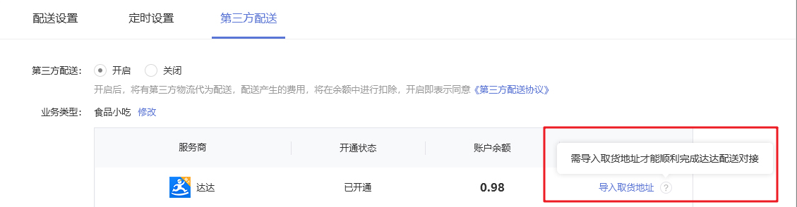 ② 开启第三方配送后,商家还需导入取货地址,才能顺利完成达达配送对接。