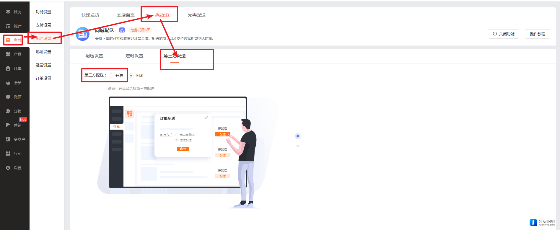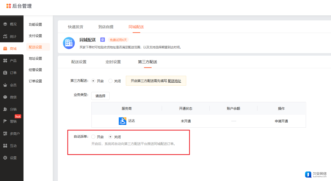 3.1.1 商家可进入【商城-配送设置-同城配送-第三方配送-自动派单】开启自动派单。