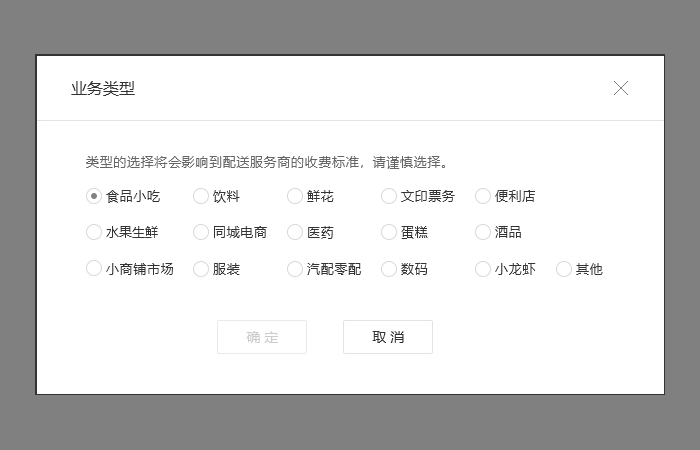 在点击“申请开通”时,需选择业务类型,类型的选择会影响到配送服务商的收费标准,请谨慎选择。