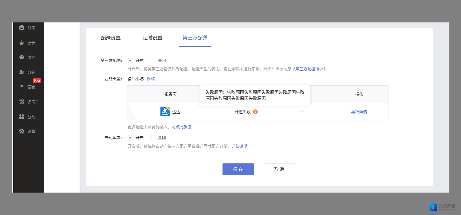 如商家开通达达失败,可查看失败原因,参照反馈进行修改后,点击“再次申请”重新开通。