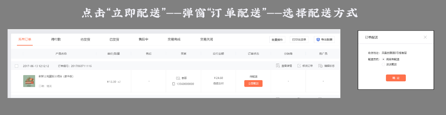 ② 关闭自动派单:关闭自动派单功能后,商家可进入【管理后台-订单-管理订单】,点击“立即配送”,设置订单配送方式。支持商家选择自行配送与达达配送两种配送方式,可根据需求灵活派单。(注:新订单完成付款,不会自动指派给呼叫配送,商家需要自行选择呼叫达达配送或自行配送)