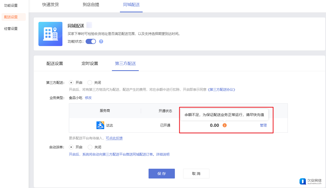 3.1.3 配送费将从达达平台进行扣除,如果在达达平台的余额不足,需要先充值才能使用达达配送。