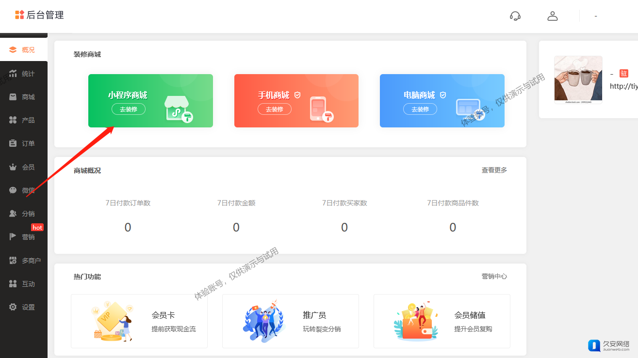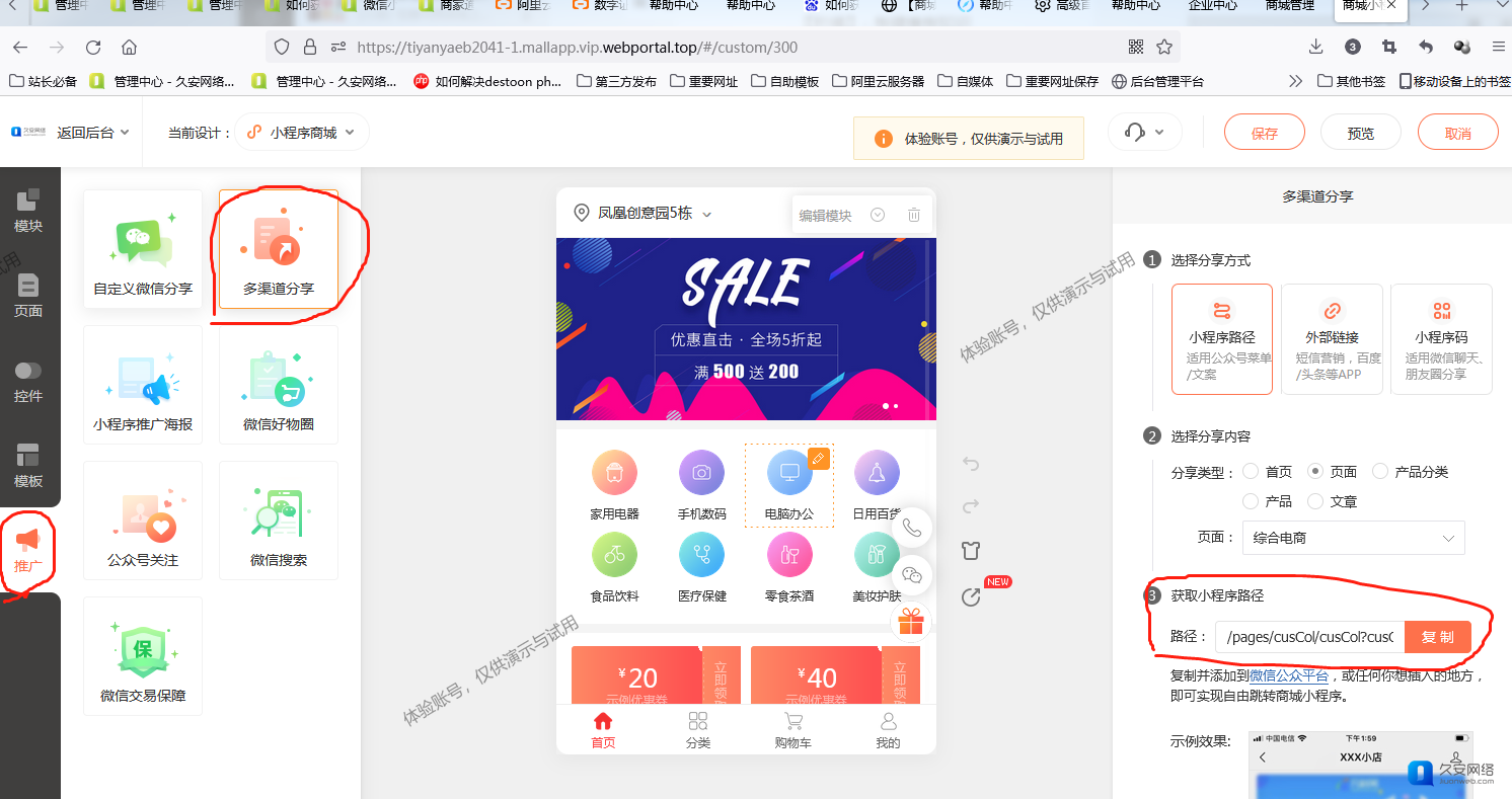 登录商城平台帐号,进入商城小程序管理后台,选择【推广-多渠道分享】右侧,选择需要的分享内容,即可获取对应的页面路径。
